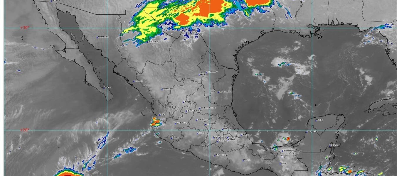 Un canal de baja presión sobre el interior del país, aunado al ingreso de humedad del océano Pacífico y el golfo de México favorecerán intervalos de chubascos en Veracruz (regiones Las Montañas y Olmeca), Nayarit (norte, centro y sur), Jalisco (oeste y sur), Colima, Tabasco (oeste y centro), Michoacán (centro, sur y costa) y Guerrero (norte, costa y sureste). Viento de componente sur (surada) de 20 a 35 km/h con rachas de 50 a 70 km/h en Coahuila (este), Nuevo León y Tamaulipas.