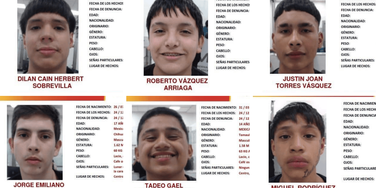 Las autoridades del estado señalaron que los adolescentes desaparecidos responden a los nombres de Joan Torres Vásquez, de 17 años; Jorge Emiliano Vega Narváez, de 17 años; Dilan Cain Herbert Sobrevilla, de 16 años; Miguel Rodríguez Estobar, de 16 años; Tadeo Gael Moreno Monreal, de 14 años; y Roberto Vázquez Arriaga, de 14 años.